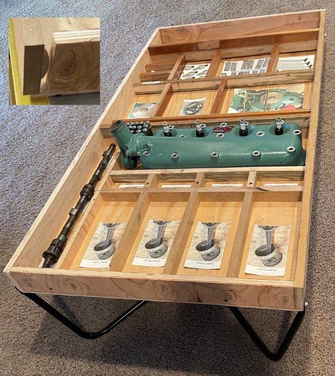 The engine parts display board is ready to accept parts. I have added the ¼” bungee cords to hold the parts down if one decided to move the storage display board around. Also added hinge hand holder to each side of the overflow parts attachment board for easy removal. In addition, I built a transmission storage holder with wheels to keep It from being damage and clean while the engine is being rebuilt.
