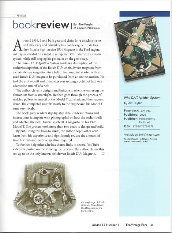 I thought a lot about your posting before giving you a reply. The reason I started this thread and wrote my book was because of the performance of my 1926 Tudor. It was running on the battery, magneto, coils, and a timer when it shorted-out when running on MAG. After investigating there was more than one possibility to fix the problem. Note, I like running on Ford Magneto because the motor sounds great and it was smooth in its performance, so it was important for me to find a solution this problem and build a fix. Yes, I also like shiny carburetors and own two Brass Zenith s4bf carburetor and built an attachment to the 1910 Bosch bracket. What is important to me is that the items I put on my car were available and are period correct for the Model T Ford years. I have deviated from the original equipment on the Model T Ford for motor performance, safety for myself and others, and improving quality of item being installed on the car. For example, I built and installed oak floorboards, and created my own upholstery, installed Colorado Disc Brakes on the rear of the car. During my search, I read a book “1910 Bosch Magneto for Ford cars.” It opened my eyes for a fix for my car, but the Bosch setups have their own problems, gears built in 1910 that wear out, noise, require lubrication, whipping, stretching chain, throwing oil, dirt, mud, breaking chain, and it was not safe. The thing I remember learning from the automobile class in high school was how important to have a good compression, good gas flow, and a hot spark. Two of the items, gas flow, cylinder compression was ok on my car. The third would require me pulling the engine and fixing the magneto which I did not want to do because the best fix would require me sending it to a professional to rebuild the magneto and the engine. That is when I decided to do my homework for a fix using a Bosch DU4 Magneto. The 1910 Bosch Magneto book talks about eliminating timer, coils, mag wire soaked in oil, and battery not needed to start or run the motor. You also get a hotter and quicker spark, cleaner spark plugs, eliminates misfiring at low and high speeds, motor runs smoothly and efficient at both low and high speeds, more power and speed, low throttling of motor, cooler running engine, and better gas mileage. I found all these things to be true after building my Bosch DU4 Magneto pulley belt setup. I thought about manufacturing a pulley belt setup but realized that I was too old at 78 to complete this project during my lifetime, so I decided to write a book “Who D.A.T. Ignition System” to explain the process.