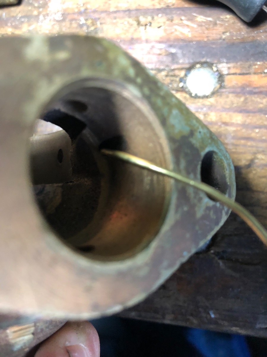 The 1913 Holley S was similar but the pick up tube was soldered to the mixing chamber cover and the holes for the gas to flow were machined to line up for gas flow. The air bleed, which also served as an overflow drain, was a hole drilled from the bottom on both the G and S.