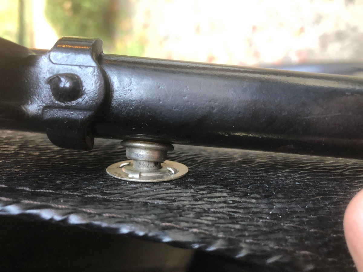 Even though this NOS side curtain is labeled for 1925, I think that it is actually for 1926-27 roadsters. The "sockets" that are installed inside the rear top bows on 1926-27 roadsters and tourings must have the extra lip to project through the grommets on the rear side curtains. ( I think Larry Smith identifies these as ANZO fasteners.) A similar "socket" without the lip is used on the body panel between the doors on 1926-27 tourings and also on the doors of most 1927 roadsters and tourings. If you use the socket without the lip on the inside of the rear top bow, the fasteners that are crimped onto the rear curtain will not snap into the socket when the side curtains are installed. That lip is to allow for the thickness of the grommets in the side curtains when it is "sandwiched" between the top bow and the rear curtain where it wraps around the back and fastens to the top bow. I think this type fastener is only used on the 1926-27 Model T's, but maybe it was used on Model A's, too. I don't know. See the photos of the sockets an how the grommet fits snug on that lip. The grommets have to be installed quite accurately in the side curtains to match the sockets.