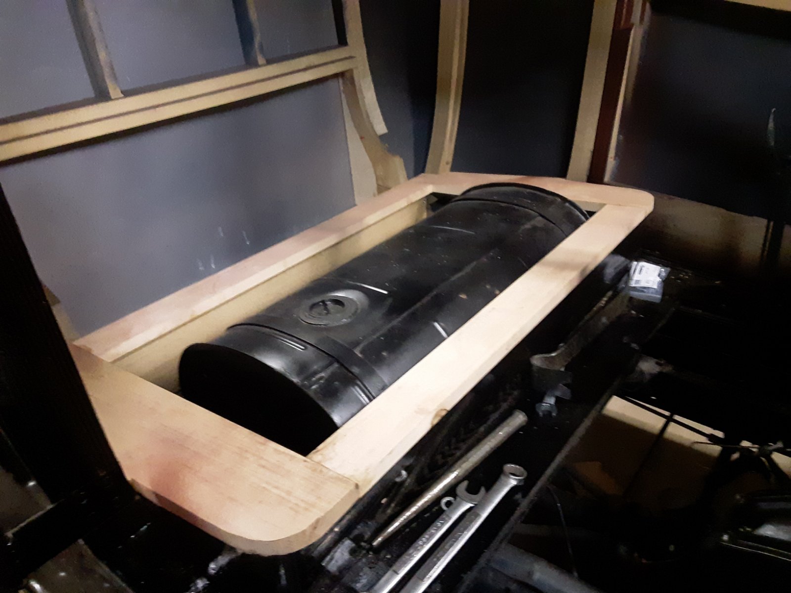George, even if it is not absolutely "correct" for your car, a wooden frame under the seat cushion is common on most Australian bodied cars, so it is period correct. Looking at your 'before' photo, the tank seems higher than the seat base, so it most likely did have a wooden base to the seat assembly, and that gave it the necessary clearance.