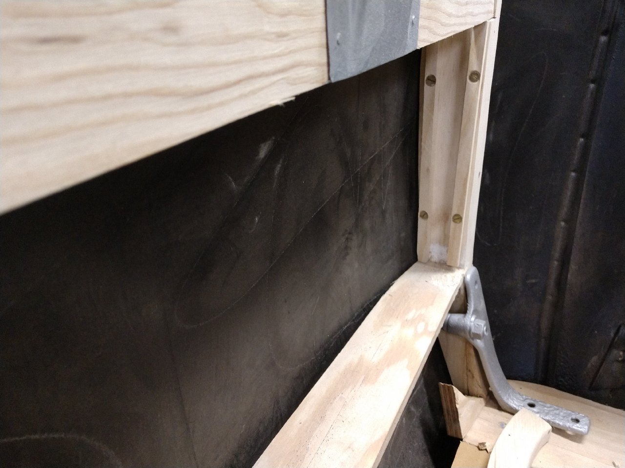 Don, the photo of the centre doors in the factory production line is interesting. The tops on those bodies look much more curved, both from the front to back, and more noticeably from side to side. Those tops have quite a considerable compound curve. Perhaps the original cardboard/masonite material could be massaged to conform to that shape, but I cannot see a sheet of plywood doing the same. The curve front to back may be easily achieved, but the side to side curve not so. If you clamp it down that will add to the load on the rather spindly cross pieces, making them loose the curve cut into them.