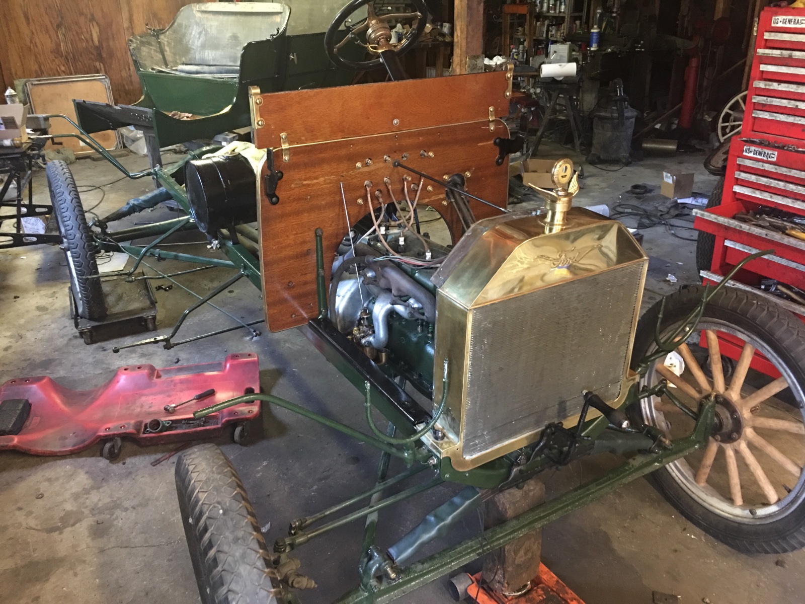This weekend should mark a significant step in the 1909 rebuild in that I expect the the body and chassis to be reunited. The wood in the body and the paint 98% done to my satisfaction. I’m sure when it gets into the sunlight, I’ll see blemishes which I may fix. The chassis has been ready for close to a year though I can always find something not quite complete. Case in point was the radiator mounting. The studs were not long enough to add the little clips for the wind shield support. So yet another afternoon was spent removing the radiator and making slightly longer studs. All it takes is time....