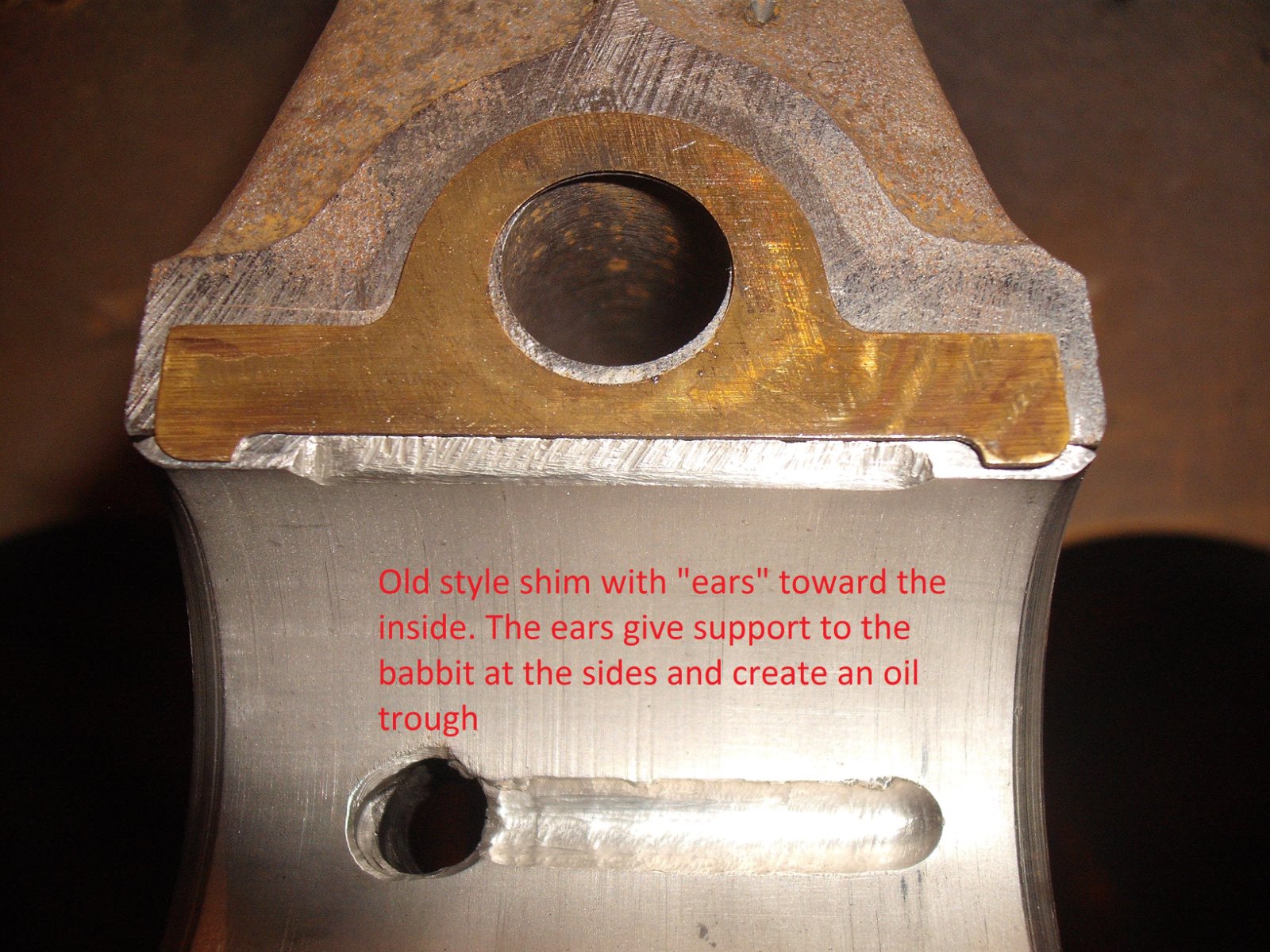 I may be just thinking crazy, but it appears to me a shim with "ears" on the inside that sit on the Babbitt at the ends of the bearings could only help. The Ford style shims and also the current repros do not give any support at all to the bearing. For example: Lets just say I have set of Ford style .004 shim packs on each side of the bearing. And lets say I am running .002 clearance on my bearing. Those measurements will "allow" the bearing the ability to break free of the block and "lift" .002. In effect allowing the bearing to slowly "beat itself to death". But the little "ears" sitting on the babbit bearing will keep the bearing from lifting. It may be the reason why Ford changed to the inside "ears" on the Model A. ??? I used to have a box of the shims with the "inside ear" where all three shims fit a model T. But I can not find them or I used them all up.