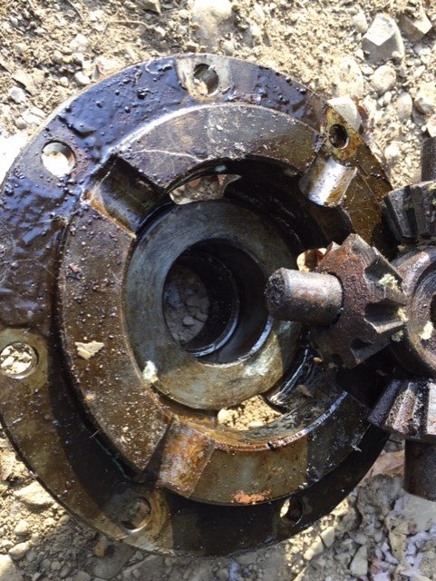The 'cage' has its boss broken - which is seen to the right on the axle a bit. The "real" problem was the two worm Hyatts which were rusted solid which explained the reason this diff did not turn.