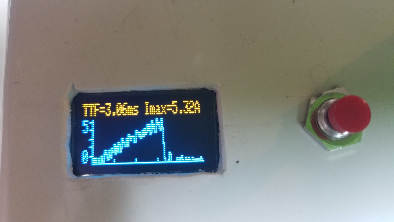 Single-shot test results showing test number, time to fire in msec, and current in amps.