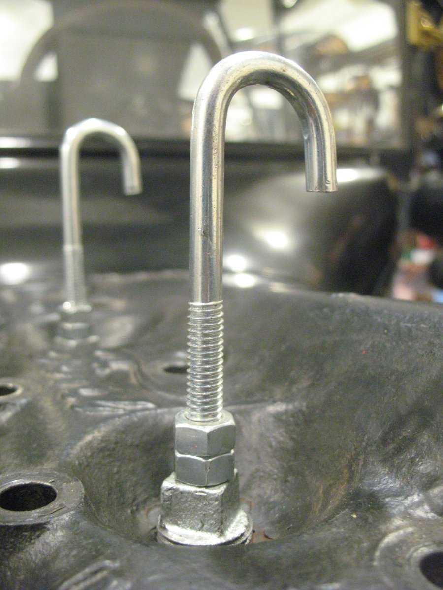 A pair of half inch pipe plugs drilled for 5/16" hooks. Put them in with a 5/8" wrench, turn the hooks toward the center of the head, and lock the nuts to keep them turned that way.