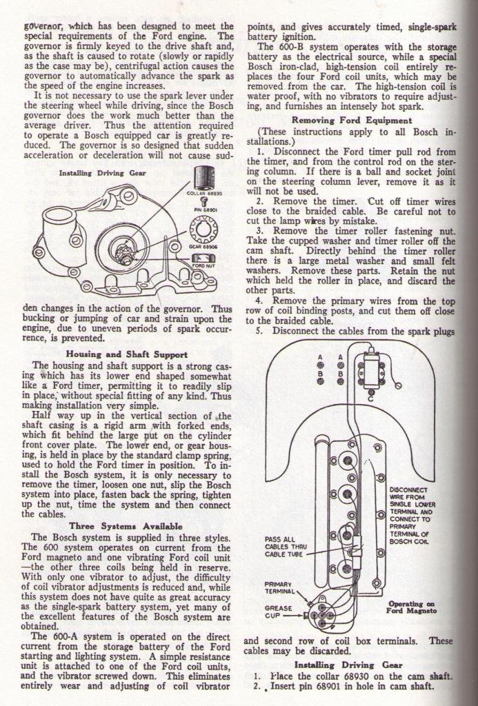 It is an American Bosch 600 distributor. At the onset of WWI the US Government took over Bosch operations in the US- which then became American Bosch. Since then it has no relationship, or parts, to the current Robert Bosch products. This is a popular model has centrifugal advance. If the kidney shaped condenser inside the housing is no longer functional a compatible condenser is often used and mounted externally. These instructions explain how it can be hooked up to buzz coils or conventional single coil. Need to add a second post for last page +
