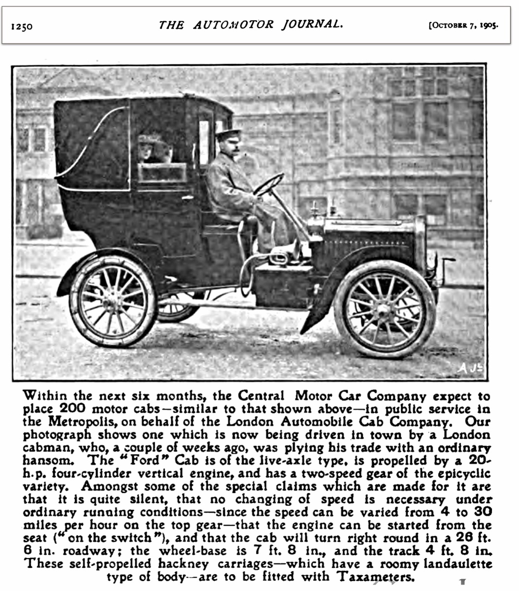 As it turns out, “London Cab Company” had a plan, and intended to place 200 Fords on the streets. Below the article works through fare values and uses for the new cabs: