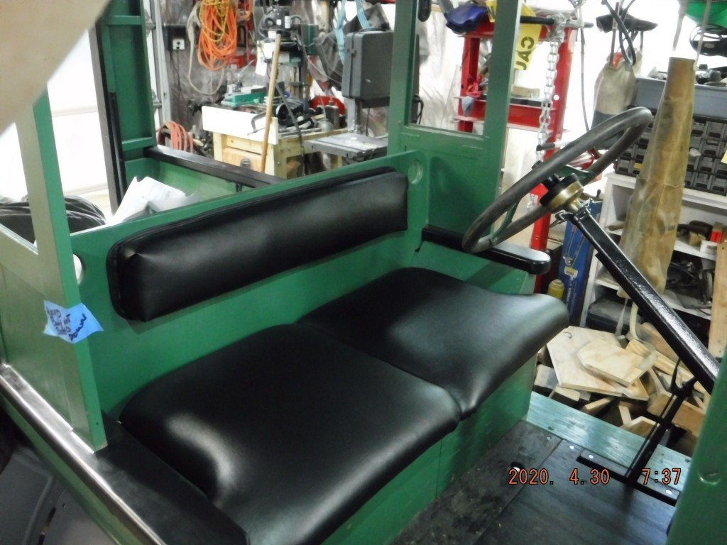 Got the front seats covered and the steering wheel installed. I'm gonna have to go to home depot soon to get more wood for the side panels. Not looking forward to that.