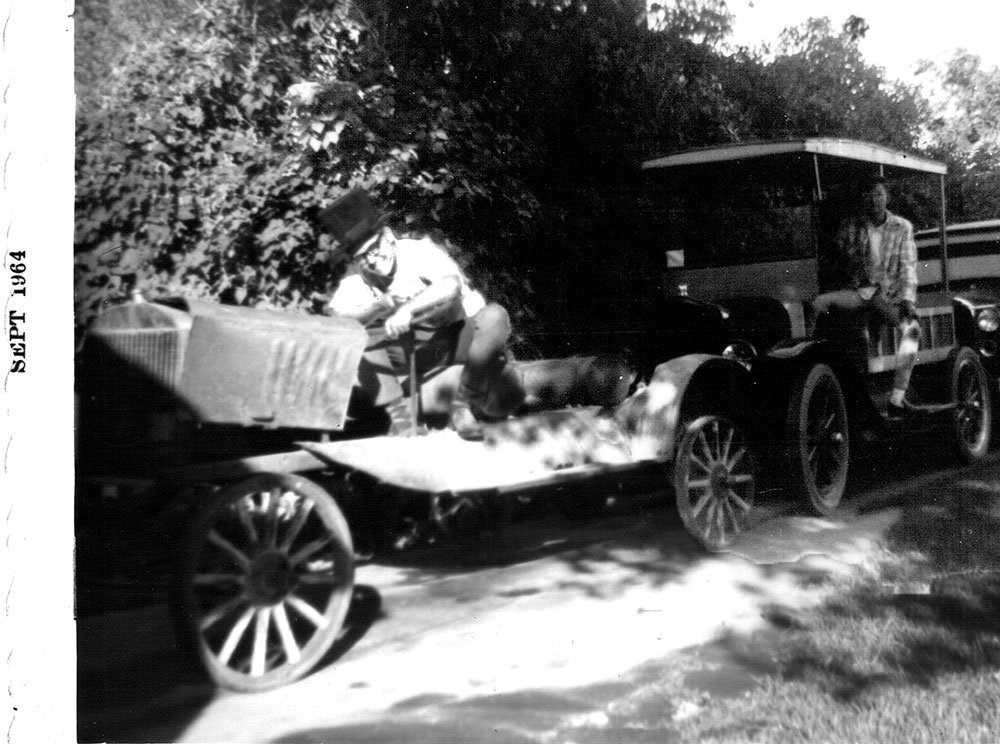I have posted pictures of my first T on a trailer several times. This is a a bit later clowning around in the driveway the day we made a silent movie. Also shown is Rich Bingham and his Depot Hack.