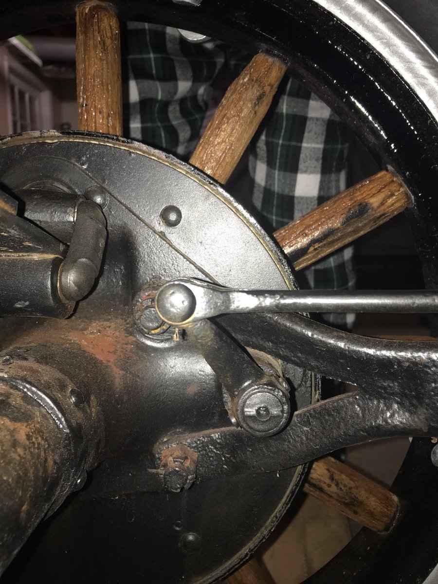 The shop in which my T resides is 100 miles from me. I can only work on it on weekends. Myself and a mechanic looked at the linkage system today and found no way to adjust. They are adjustable at the front of the brake rods via the threaded portion. They are extended fully and will not lengthen any more. Maybe they are the wrong rods. They are 52" long. Anyone have a measurement on the "24 brake rods?