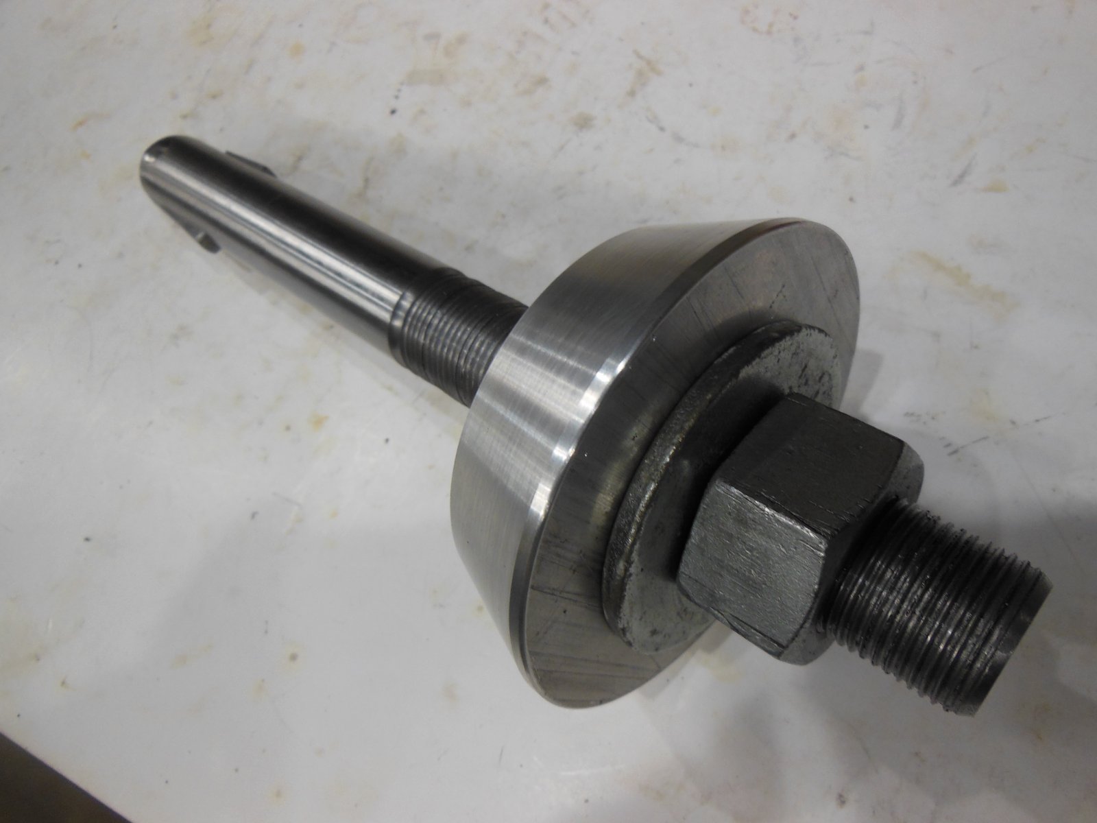 Scott, The shaft is a left over 1" PH 4140 with 16 TPI. The fingers are scraps of A2 and hardened by eye. The spring is from a ballpoint pen and too soft, so I have to wind one from piano wire. The spring doesn't have to do any more than extend the fingers after It goes through the hole as the fingers have a 5 deg. angle to hold there position and hold the load. The pressure cone is a donut hole from a 1 1/2 7075 plate. All materials are left over from previous commercial work.