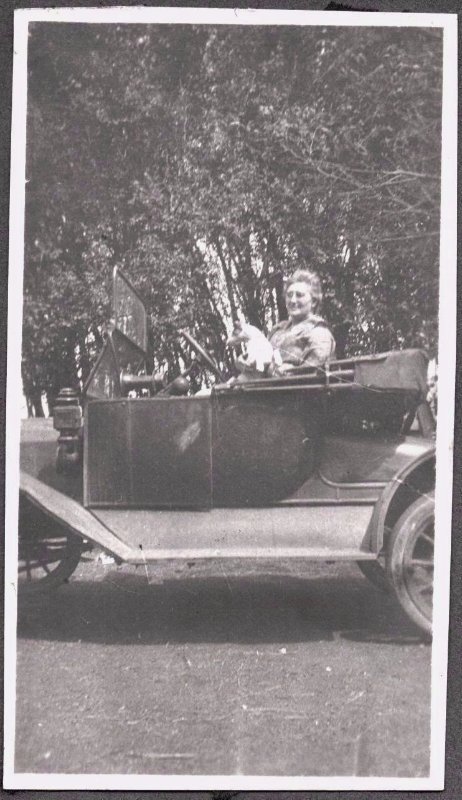 This last photo is a bit of a mystery to me. Is that a pet badger, teddy bear or dead gopher he is holding? It's staged to look like one of the youngsters is driving. I see a pair of feet under the far running board.
