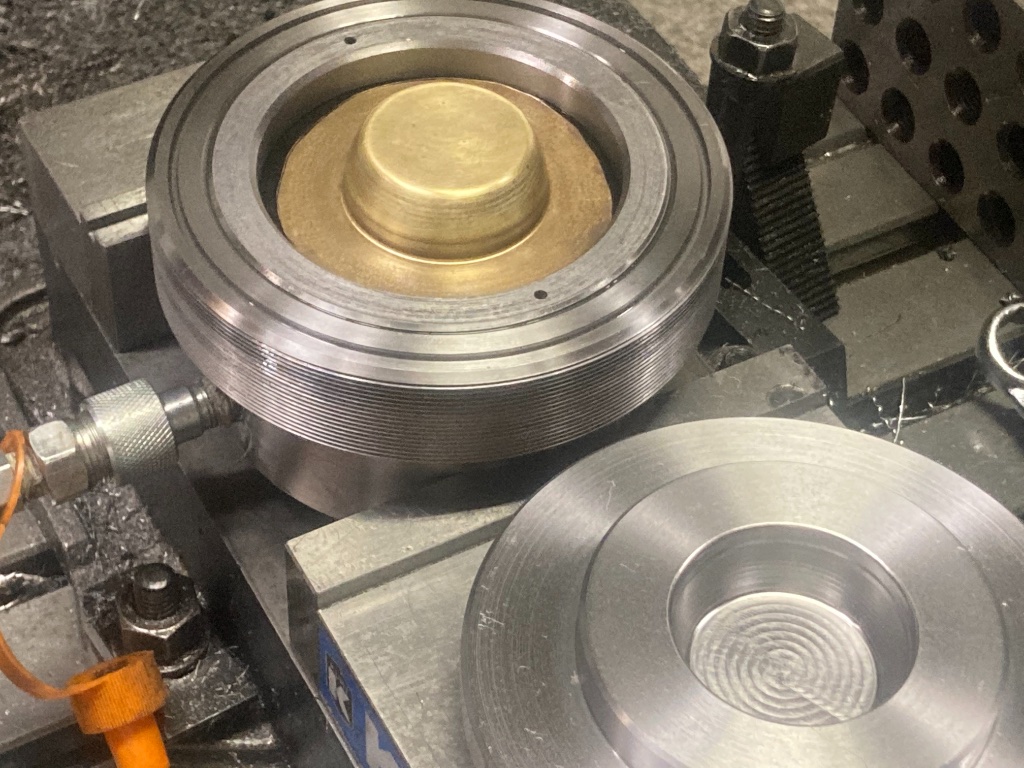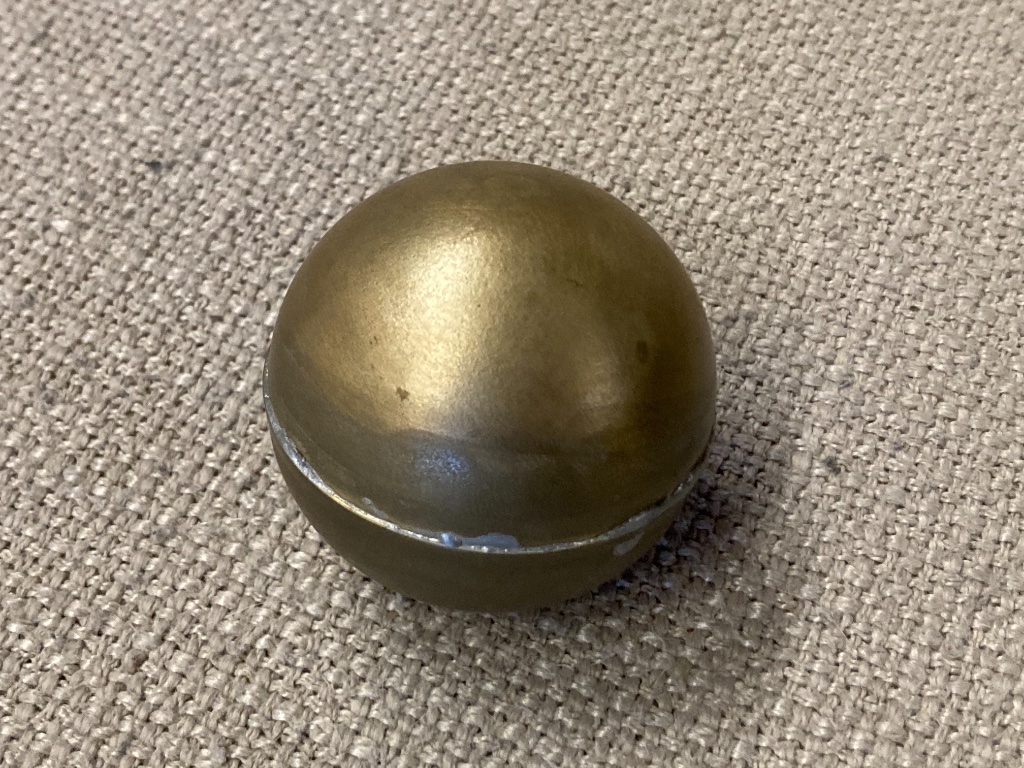 Here is the hydraulic forming fixture concept; And after several hours of machine work; After several more hours of forming; And finally, after several minutes of soldering; Both float styles came out on size (that was the easy part), and on weight (a bit trickier). The full sphere Model S float weighs in at a whopping 30 grams, and the flat bottom Model SR a mere 22 grams.