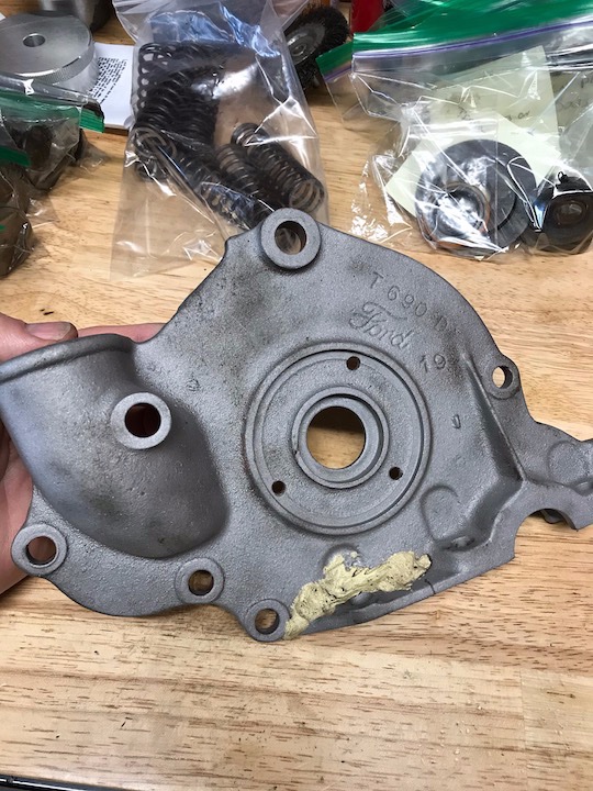 First I pulled off the roller and saved all this in a plastic bag. Next the felt washer came out. I'm going to use a neoprene one. To get the cam out first the cover had to come off. You can see the repair on the cover. Not sure if this is JB Weld or brazed.