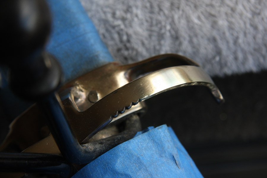 I wanted to repair the original quadrant because the reproduction I bought was so different in the width and shape of its mounting collar. I also did not want to disassemble the steering column any more than absolutely necessary. So that meant adding material to the original notched areas and then cutting new notches, all with the collar and control levers in place. Brent said "No sweat!"