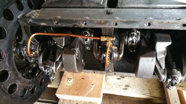 First, it was plumbed with some copper tubing, supplying oil(theoretically) to each of the main bearing caps. There was no internal oil distribution tube, but also had dippers on the ends of the rod caps. Those internal copper oil lines were plumbed to the front of the pan so all three caps got oil. It resembled a pressurized system, however there was no oil pump. There was a slit cut in the deepest part of the pan at the flywheel end and an external pipe had been brazed on so that "theoretically" oil would splash round, get splashed into that slit in the pan, and carried by that external tubing back to the front of the pan where it would be distributed to the three bearing caps. Lots of nice work and pretty copper and brass, but it just doesn't seem to me that it would work well as there is no pressure to force the oil through the external tube to the front and then to the bearing caps.