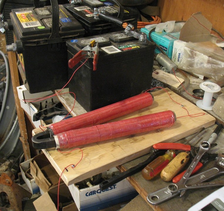 The second vesion I made was wire wrapped around two separate sections of copper tubing shown below. This allowed inserting both ends of the magnets into the tubing. I hooked this up to two 12 volt batteries. It charged much faster.
