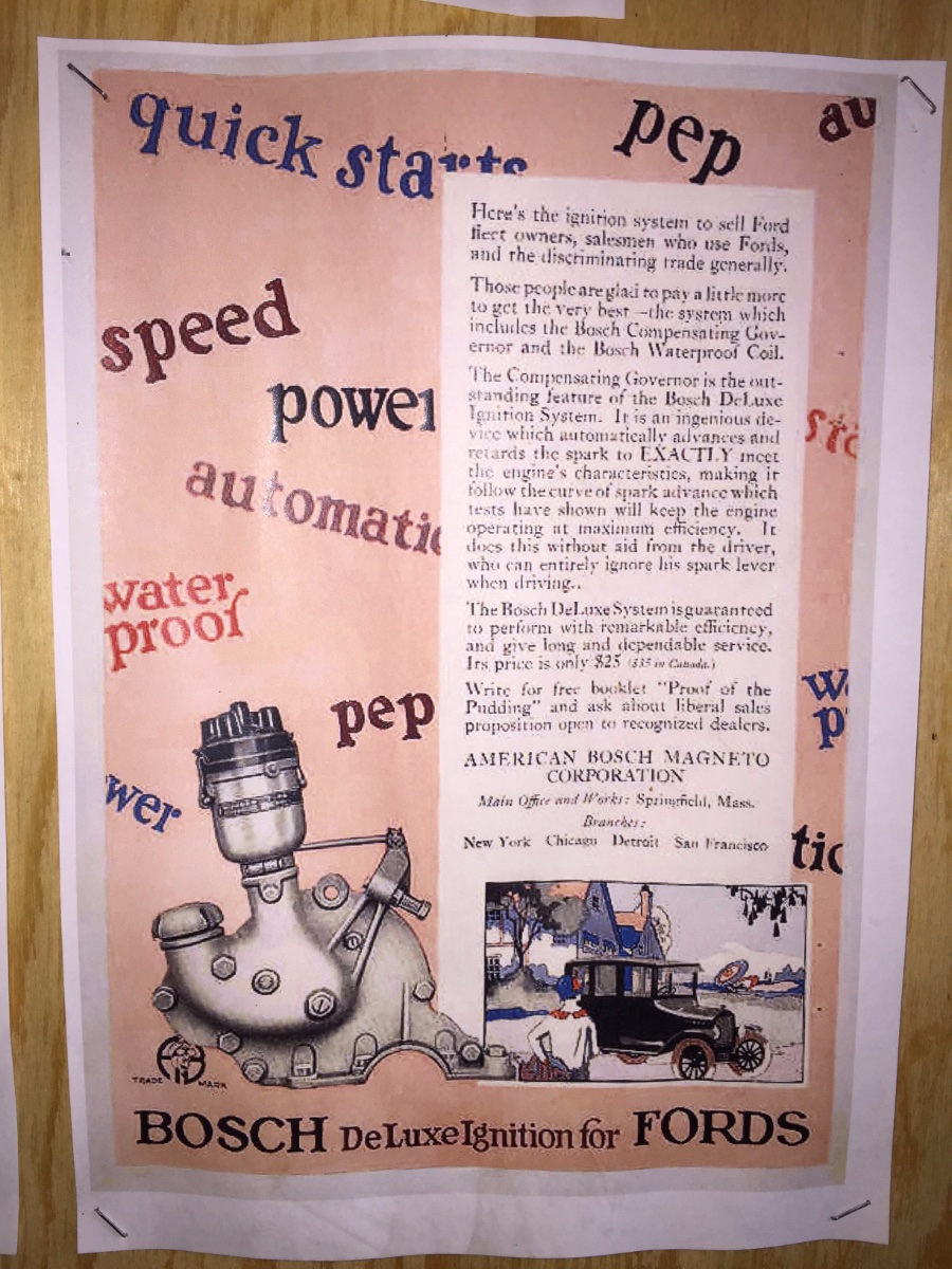 It is an American Bosch 600 distributor. At the onset of WWI the US Government took over Bosch operations in the US- which then became American Bosch. Since then it has no relationship, or parts, to the current Robert Bosch products. This is a popular model has centrifugal advance. If the kidney shaped condenser inside the housing is no longer functional a compatible condenser is often used and mounted externally. These instructions explain how it can be hooked up to buzz coils or conventional single coil. Need to add a second post for last page +
