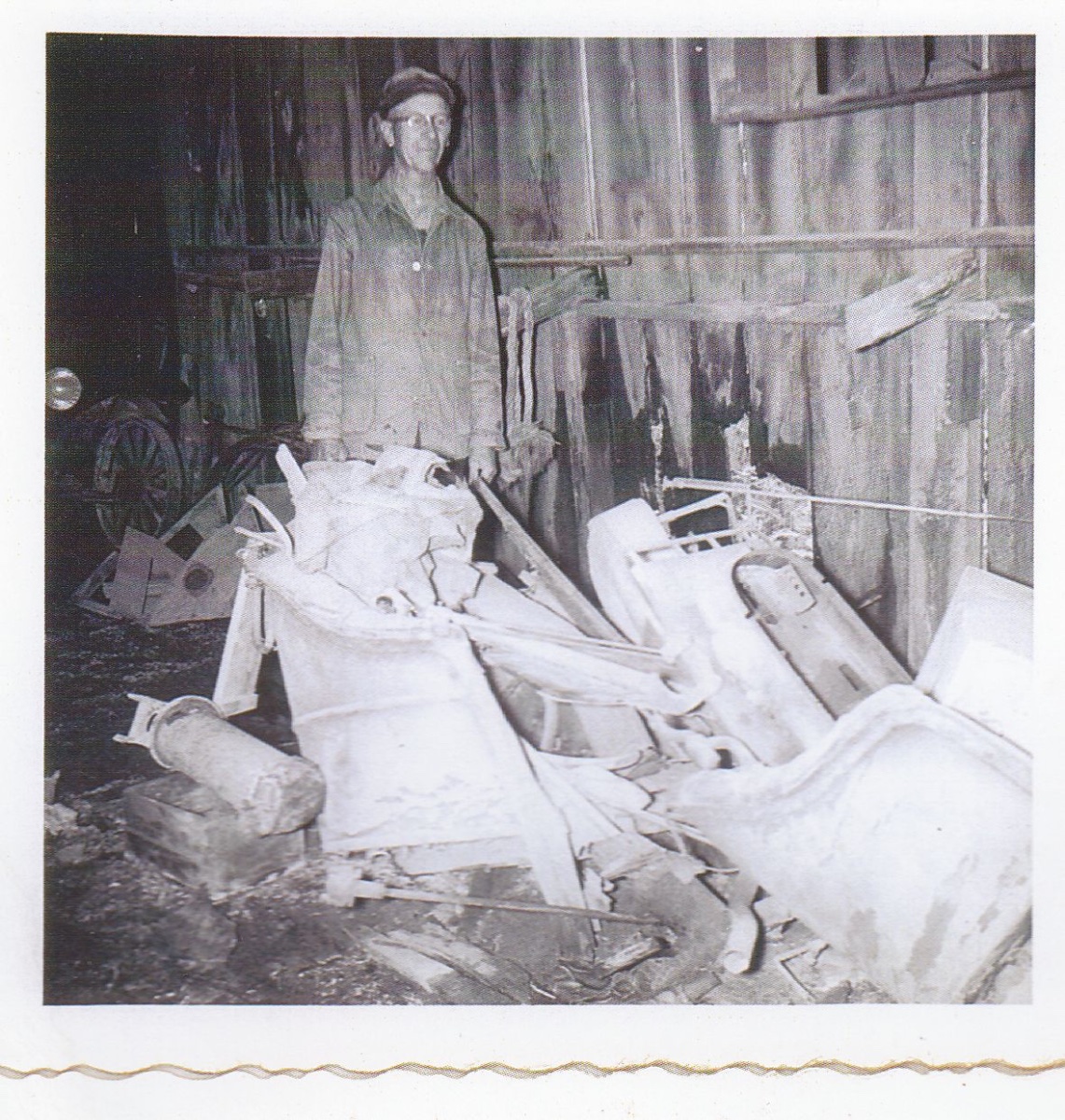 Here is what little I have, Rob. These are pics of the discovery of B#1. I wish now I would have recorded the story. It was found in Missouri, and the tall old farmer was the owner. He was going to restore it one day. LD Porter convinced him that he’d rather have a couple hundred bucks. A couple small treasures I have is a pencil rubbing of the serial number, and one of the hubcap medallions. It was dinked up and he replaced it with another.
