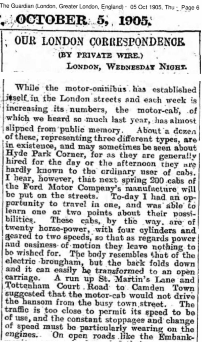 As it turns out, “London Cab Company” had a plan, and intended to place 200 Fords on the streets. Below the article works through fare values and uses for the new cabs: