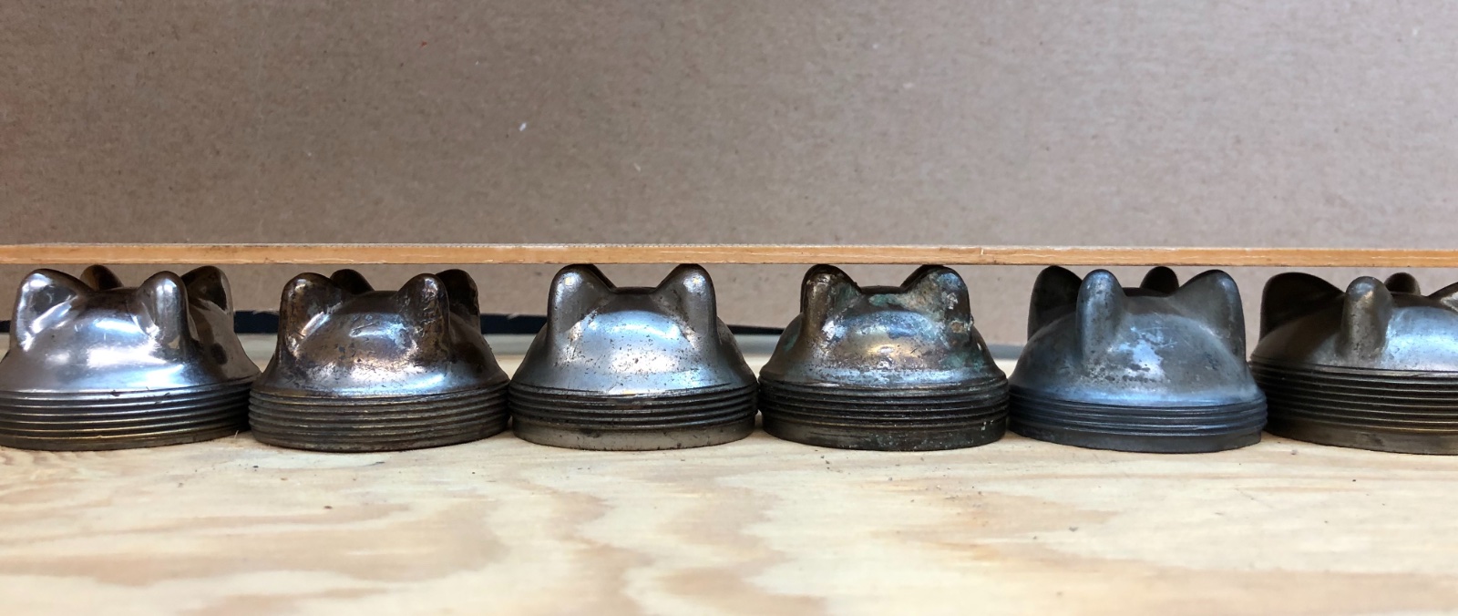 These are regular caps to me, and are made similar, but #1 on the right is heavy brass, and #2 on the right is lightweight alum or zinc ?cast, likely made in the '18 period, as some hub caps then were made of the same material too. The ones on the far left have the 'rim' under, these exhibit a more machined rim. Seems the 'rounded or rolled over' under rim of the cap shown in posts above is likely the '26 Improved version. Think these on the right end in my picture are maybe from '25 period. Who knows, need to do more investigation, if what Bruce found is the only change order info, don't know.
