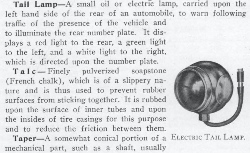 Generally all the early tail lamps were made with a green light to the outside, as indicator of moving vehicle, a white light to illuminate the presence of a license plate, and red danger light projecting to the rear, to warn approaching drivers.