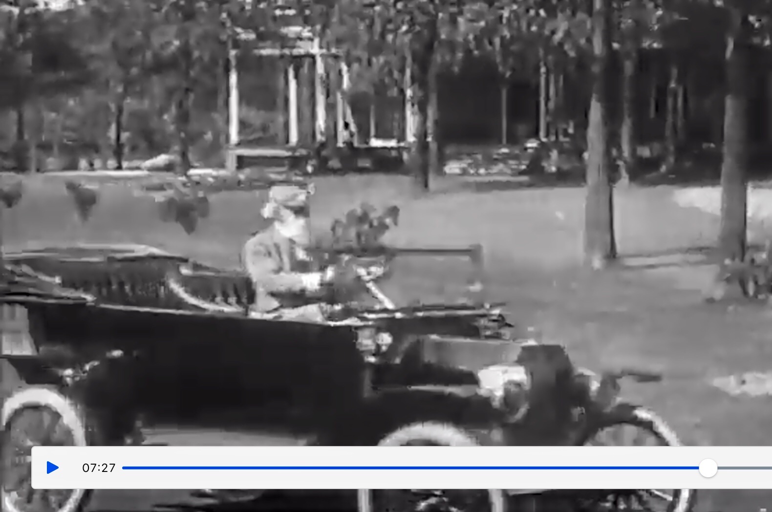 From Ford News clips. This is one of many FMC production films at the National Archives. Ford began filming news shorts that were distributed to theaters around the country, beginning in 1915. Henry Ford cutting down a tree, playing with grandchild(?), plowing with tractor, and arriving at a steam engine in a large enclosed car:
