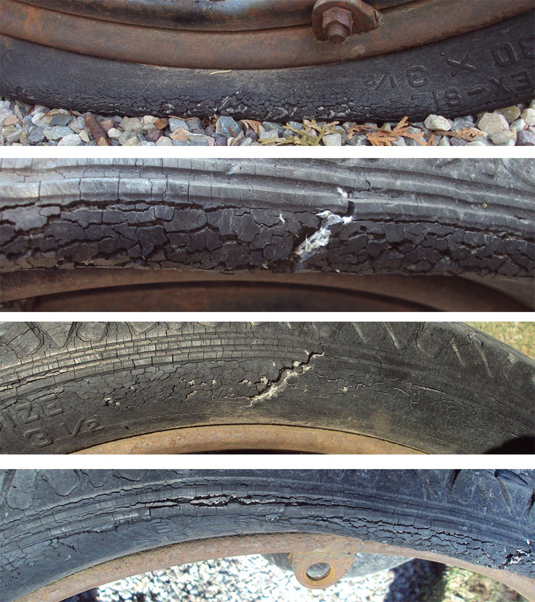 Tip on preventing sidewall cracks. I used to work in a hardware store that sold classic wax products. The rep told me to use vinal top wax on tires. Seals the rubber & stays pretty much untill rubbed off. Been using it ever since. Its no longer available, but some you tubing & found that mop & glo liquid floor wax worked. Tried it. Has the same look & feel as the old vinal top wax. Seems to work very well. I have used it on older tires & cracking is not getting any worse. I put it on about once a year.