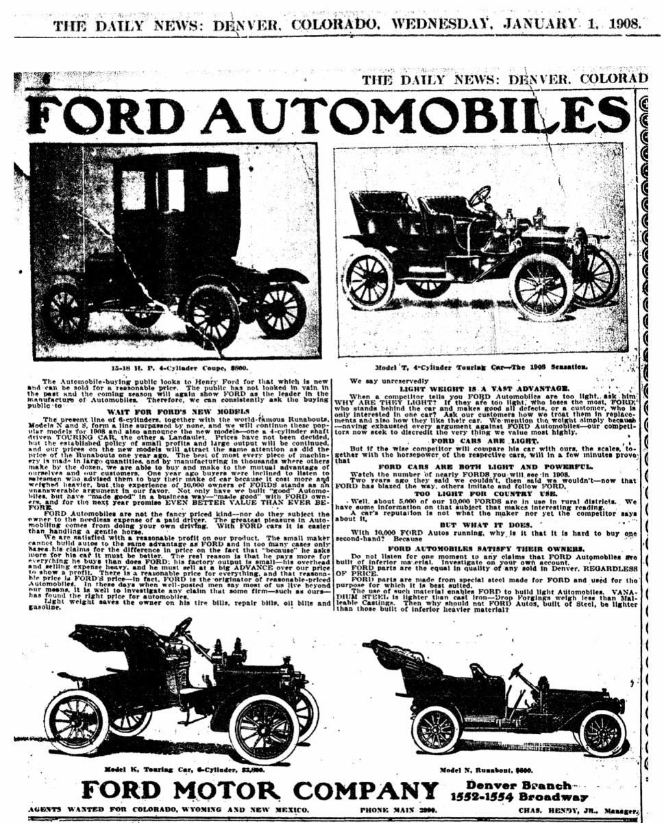 The January 1, 1908 ad above is very interesting. Is the car on the upper right a Model S Touring rather than a Model T? It is labeled “Model T”, but is right hand drive, has a single lever and the crank appears to go through the radiator. Isn't there an existing Model S Touring that was restored a few years ago?
