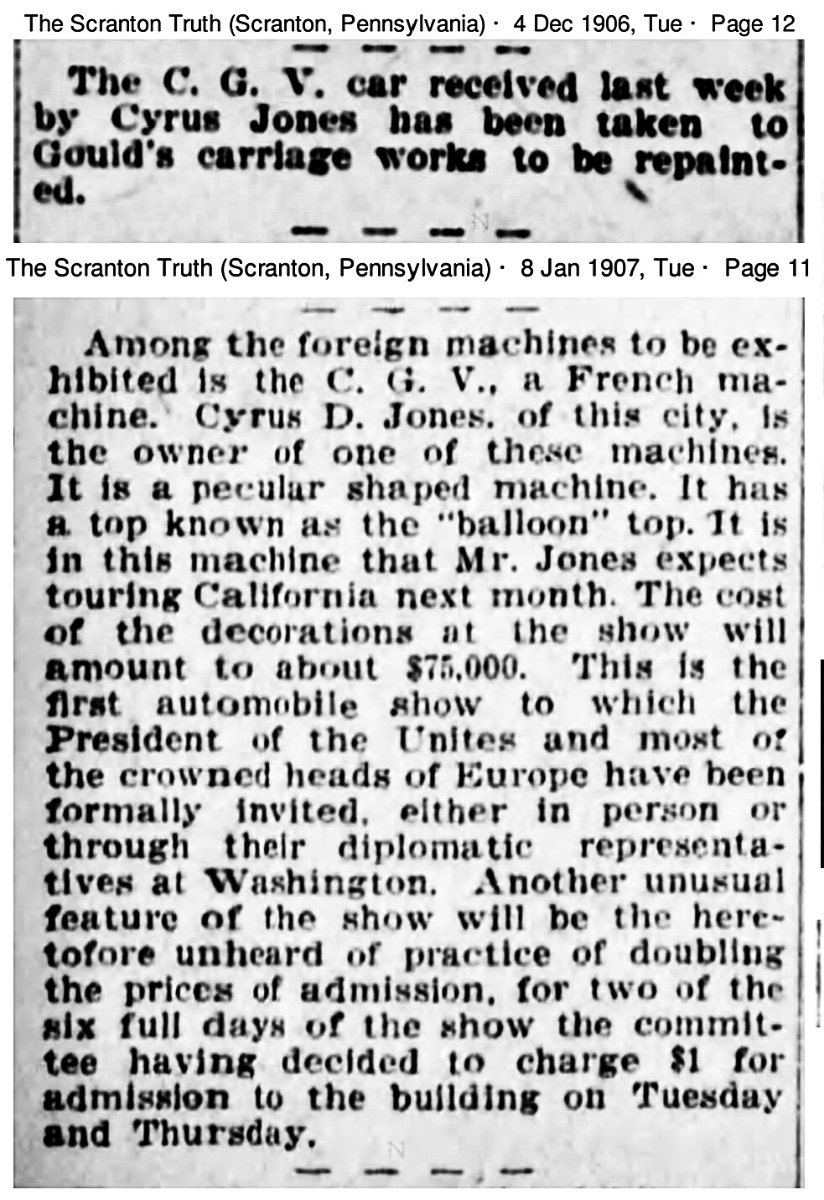 Before 1906 ends, and into 1907, one more automobile for the Jones, an imported C.G.V:
