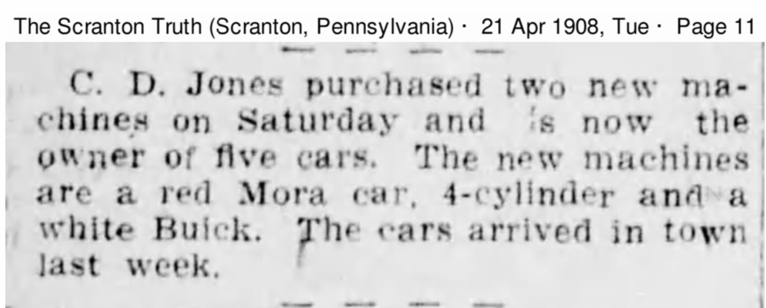 And on into 1908, and two more cars. The Jones are reported to now own five cars, buying a new Mora and Buick. I don’t know if our six cylinder Ford has made the cut into 1908: