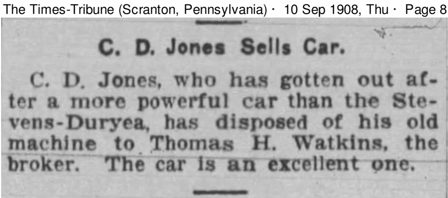 Still during 1908, the Jones dispose of a Stevens Duryea. Cyrus Jones has owned at least 14 cars between 1901 and 1908 by my count.