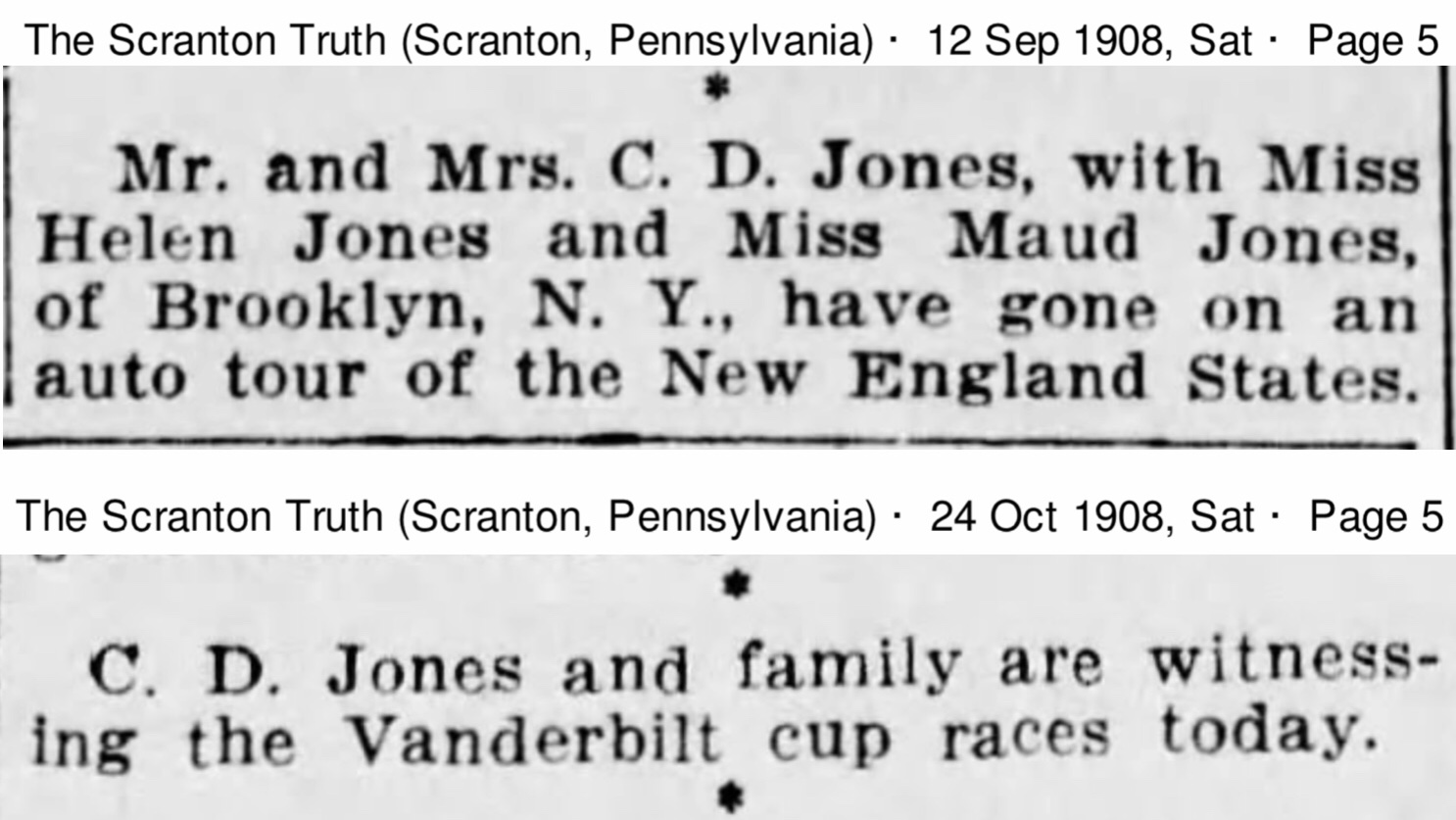 The Jones continue to enjoy their automobiles through 1908, touring eastern states and attending the Vanderbilt Cup Races: