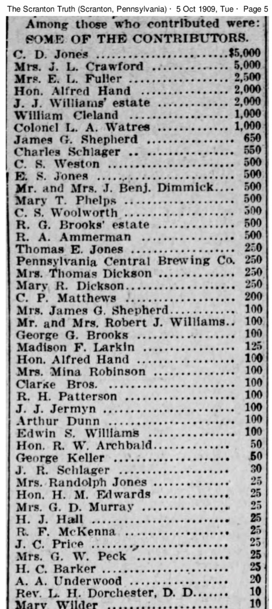 The Jones again demonstrate their philanthropic side, donating the largest amount listed among Scrantonians to the Salvation Army, about $125,000 in todays dollars: