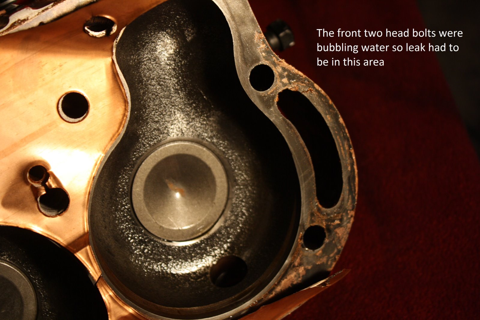 Well I got the radiator all cleaned out, pressure tested and installed. No leaks so it was time for a longer test run. The engine started easily, settled down to a nice idle, and things were really looking good. Then all hell broke loose. I noticed an oil leak near the passenger side crankcase arm. It is leaking between the two hogs head bolts at the front and rear of the arm. Not a little leak but a stream the size of a pencil lead. Not a drip drip type of thing but a steady stream. Then I noticed oil leaking out the threads of #1 spark plug. And about that time The front two head bolts started bubbling water... And then the %^$#@ rebuilt starter (I will not say what vendor it came from other than it was not Lang's) started pouring oil out the front of the starter. So it looks like I have a blown head gasket, and I will have to remove the engine to remove the crankcase and see what's wrong with the gasket ??. The crankcase was straightened on a pan jig so I do not have a clue how I could have that bad of a leak. Im not really sure if the oil at #1 plug is oil or oily water. I did every precaution when installing the head gasket and used guide pins to lower the head into place, so that is another "I do not have a clue what could have went wrong.