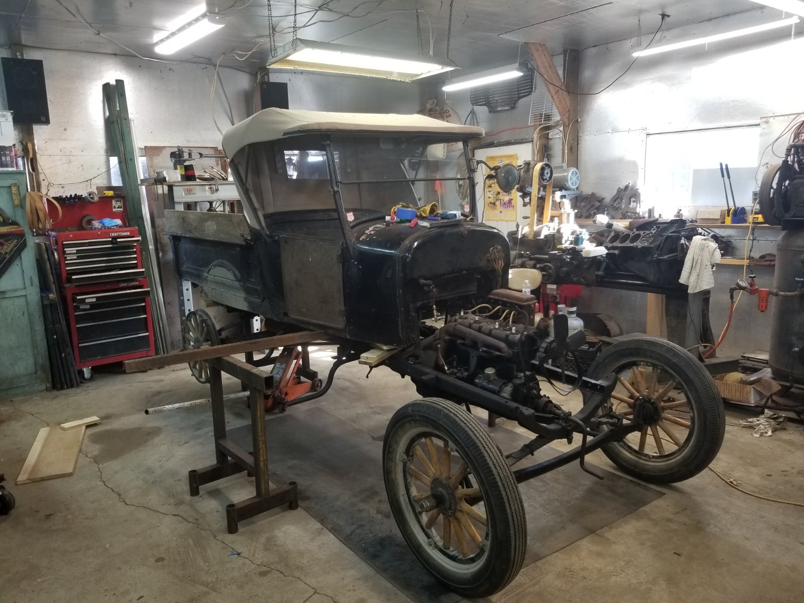 I'm almost ready to mount my 1910 Touring body onto the chassis and need some suggestions as to the best method to accomplish this. The body is still out west with Ray Wells, and until the stay-at-home order there is lifted he cannot ship it back, but I'd like to have an idea as to how to mount it onto the chassis as carefully as possible. It is completely refinished with a brand a new interior, so I imagine it will be a tad heavy. I've thought about just asking some friends over to heft it up and over but we would have to lift it past the gas tank, which sits fairly high. Maybe taking off the wheels and lowering the frame down would help. I do have an overhead chain fall, but my pole barn trusses are not super high so I'm not sure the chain fall could lift it high enough. Besides, I'm thinking if I attached four straps under the body and hooked them on the chain fall it may buckle the sides in. Anyone with experience mounting an early touring body I'd sure appreciate your input - thanks!