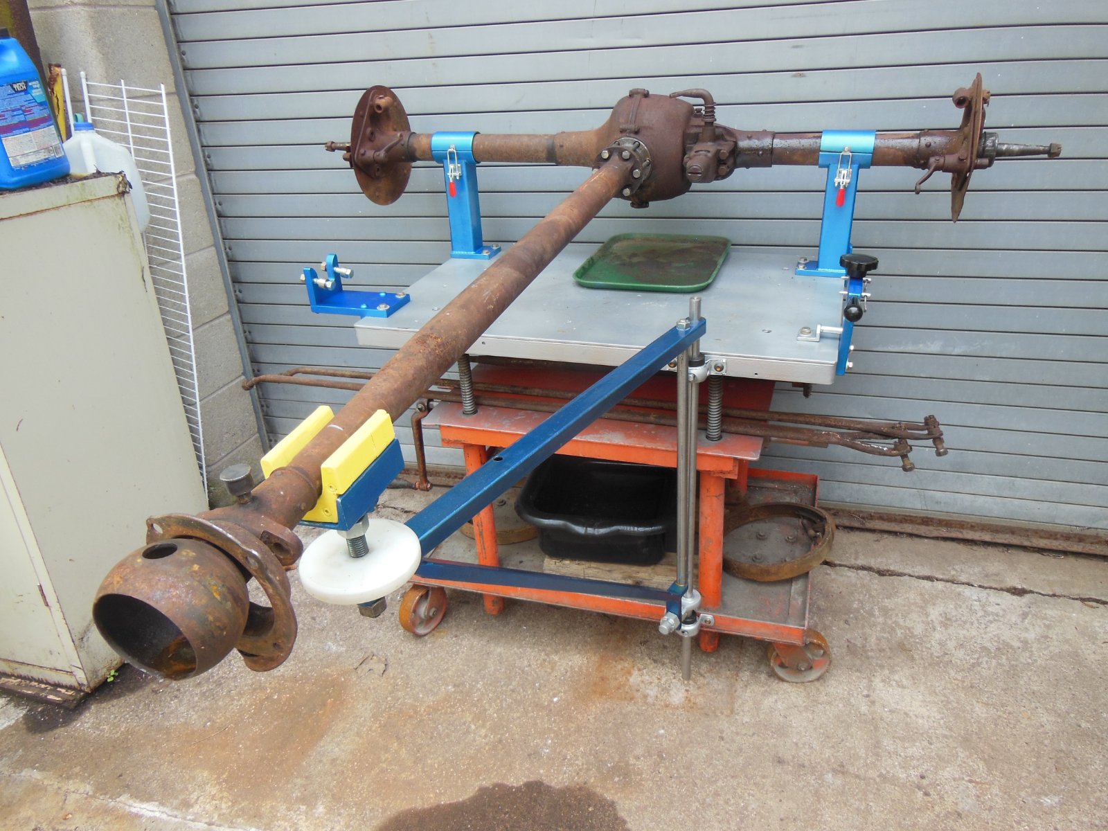 Great setup! Sure beats the trash can that I used to support my driveshaft housing. I did cut a hole in a 2x10 and bolted it to my workbench to support the axle housing.