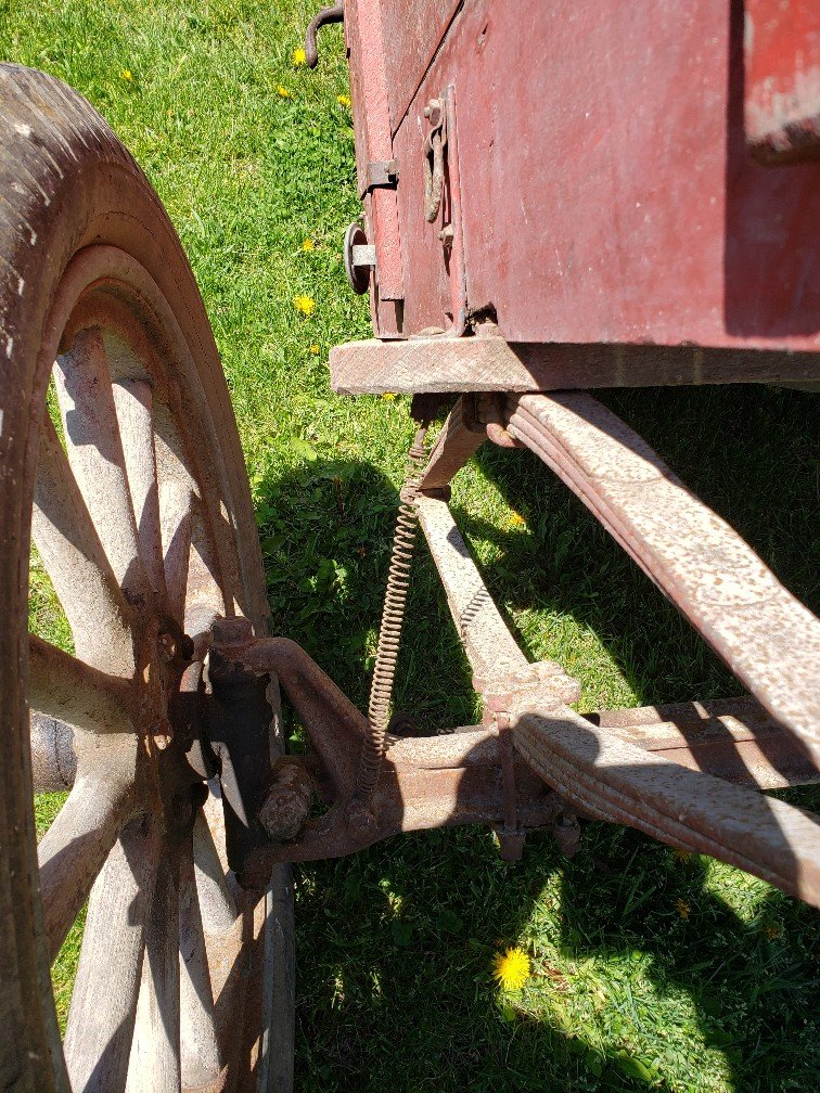 Looking through the local ads online today and this was just posted yesterday. Only an hour away so I had to buy it before some "yard art" person let's it outside to rot. It was purchased from an older couple that brought it from their neighborhood when he retired from farming back in 2000. His dad had made it for use on the farm. The axle is an Overland and I love the old reflectors and slow moving vehicle symbol painted on the back. I will clean it up, repair only what needs to be, and then "paint" it with Penetrol to keep the original paint and patina. It has an Acme style ball hitch so I would love to hook it up to a TT and see how she goes! I had to give $200, but I don't think I did too bad on the deal. I'll post some pictures when I'm done with it.