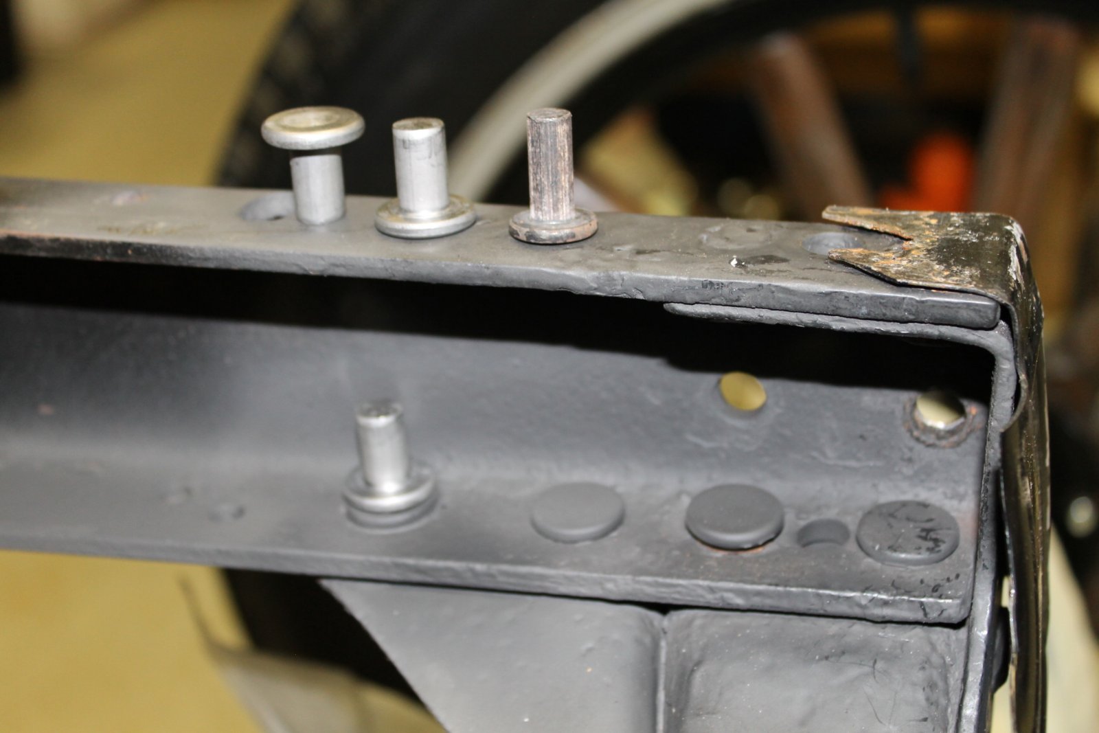 I show a picture with a "modified" tabs bent to make a 25 car apron fit to align with the pan's crank hole. I also, just installed some new rivets which are different then the Cars, larger diameter head. Mcmaster part number 97032A389