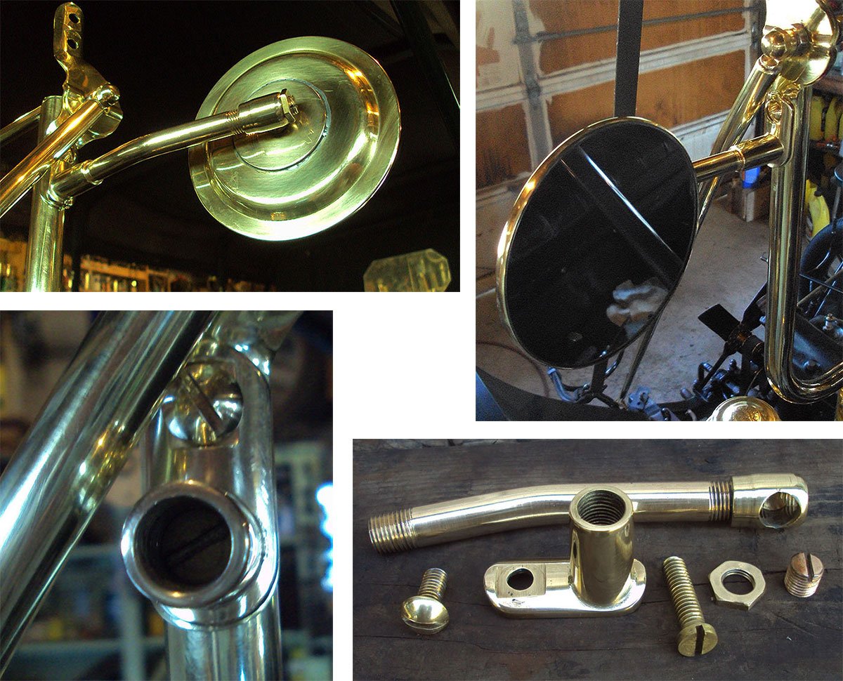 I have the same side mirrors attached to the windshield frame. The factory bracket was so flimsy that it was useless, so, I cut 1/8 inch brass plate to put inside of the original holder one for each side and now it is nice and sturdy. Also have an old piece of water hose under the clamp to keep from scratching the frame. I do like the bracket that rich made but i have no access to a lathe to make the fancy parts. Frank