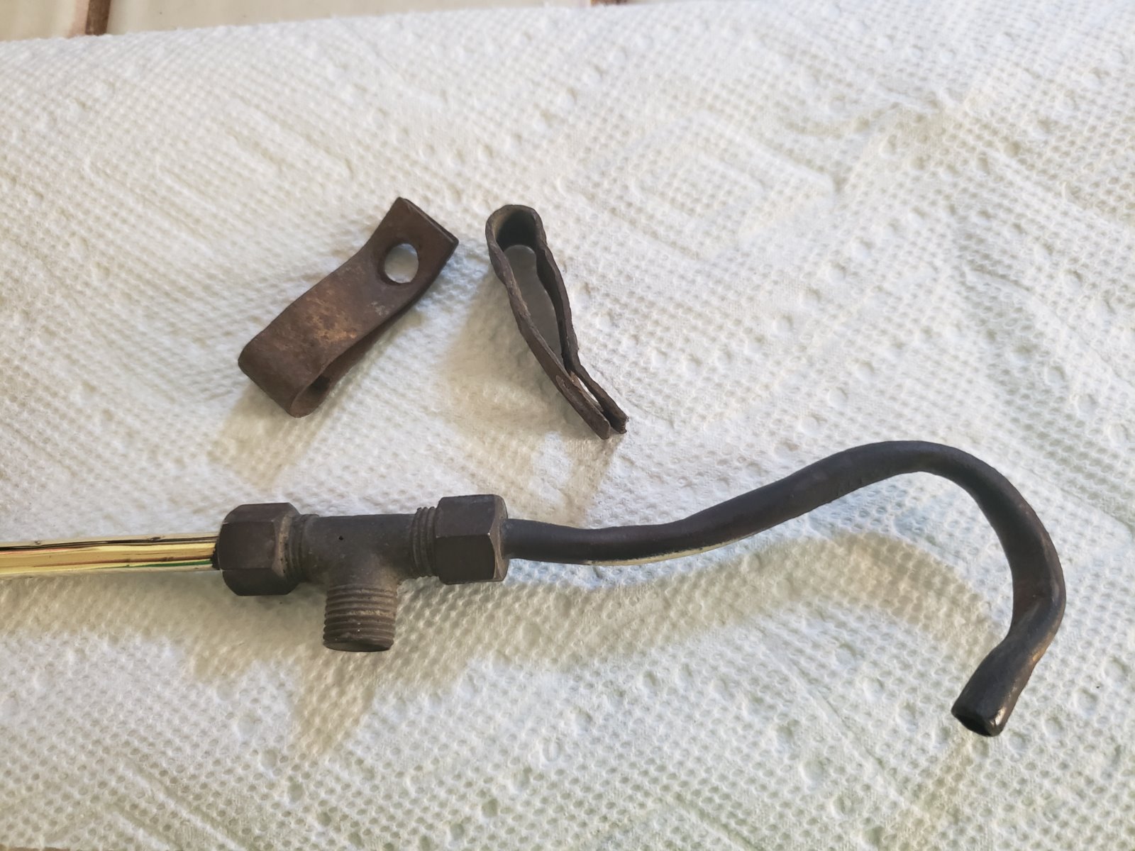 Curious whether the tube mounting clips shown here are OEM parts. This carbide gas supply line is believed to have been removed from a 1910 chassis, where the compression tee is certainly not an original part, and where this assembly was fastened to the bottom of the frame, using the same cotter pinned screws that hold the engine splash pans on. If OEM parts, I'm curious when these were used. Many thanks for your thoughts and comments.