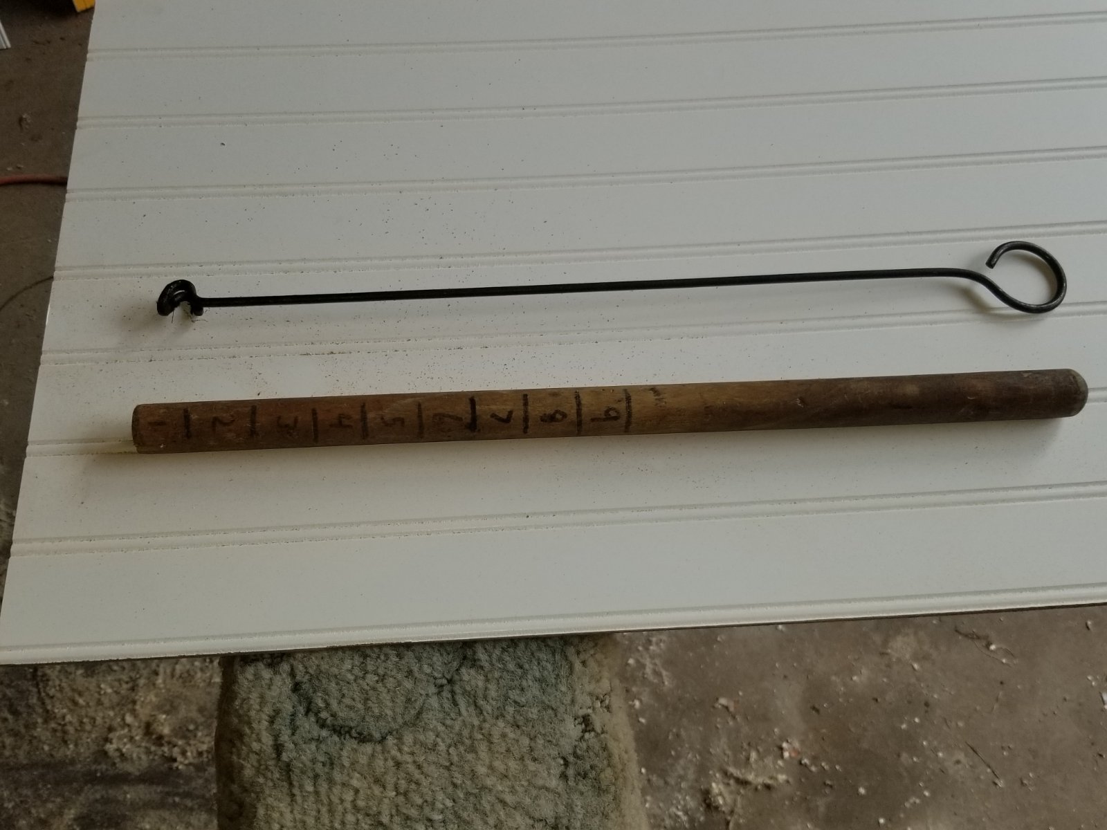 Mine has a wooden handle with the ever-fading name and 3 digit phone number of a gas station that I assume gave them away. The metal shaft is notched to mark gallons in the fuel tank. On the end is a deep notch/groove that fits over the petcocks to allow you to check the oil without having to crawl under the car.