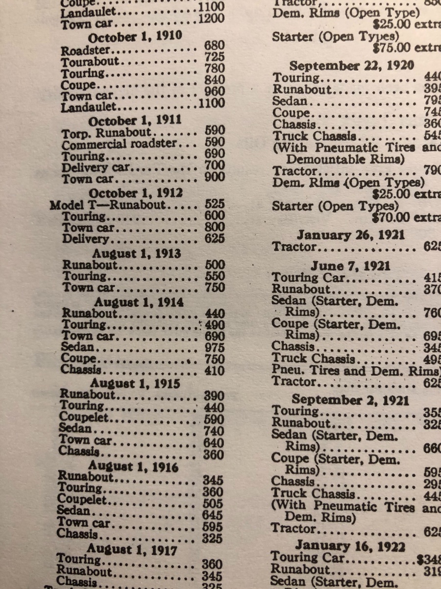 Is there a resource that depicts what T pricing was through the years of production.? It's easy to find what the lowest OEM price was.... but wondering for instance what Ford was charging in the first or second quarter of 1915 for a touring car.
