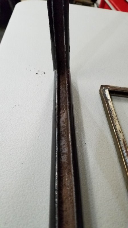 The right side upright rusted and broke at the top of the bracket and I'm replacing it with a "new" one cut from a junk frame. I'm waiting for rivets to arrive before I install new rivets, paint, and reassemble. The frame is three separate parts, not welded together but riveted into the brackets. The brass channel is also a bottom piece and two separate side pieces.