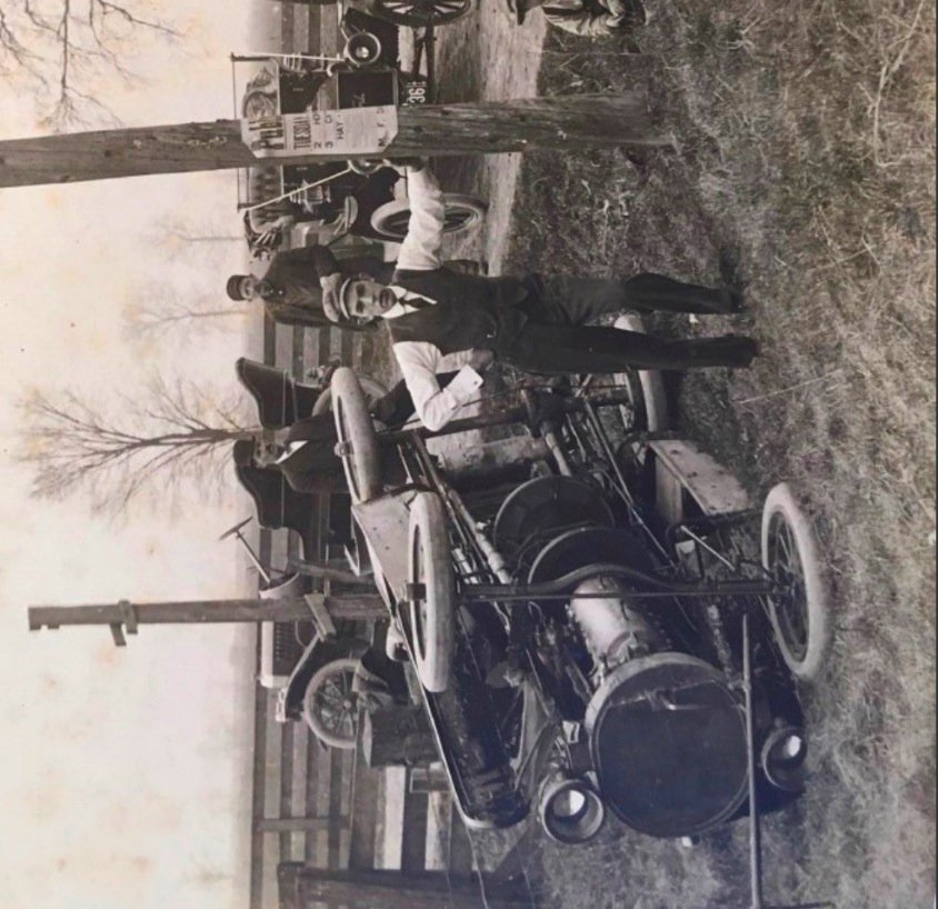 I agree with you Erik, I believe the car on its side is a 1907 Lambert. It looks to be friction drive and the radiator is round with the crank through the bottom. I also think the car in the background is a 1909 Lambert. The 1909 Lambert shown below has the same details including the bulge toward the rear of the hood.