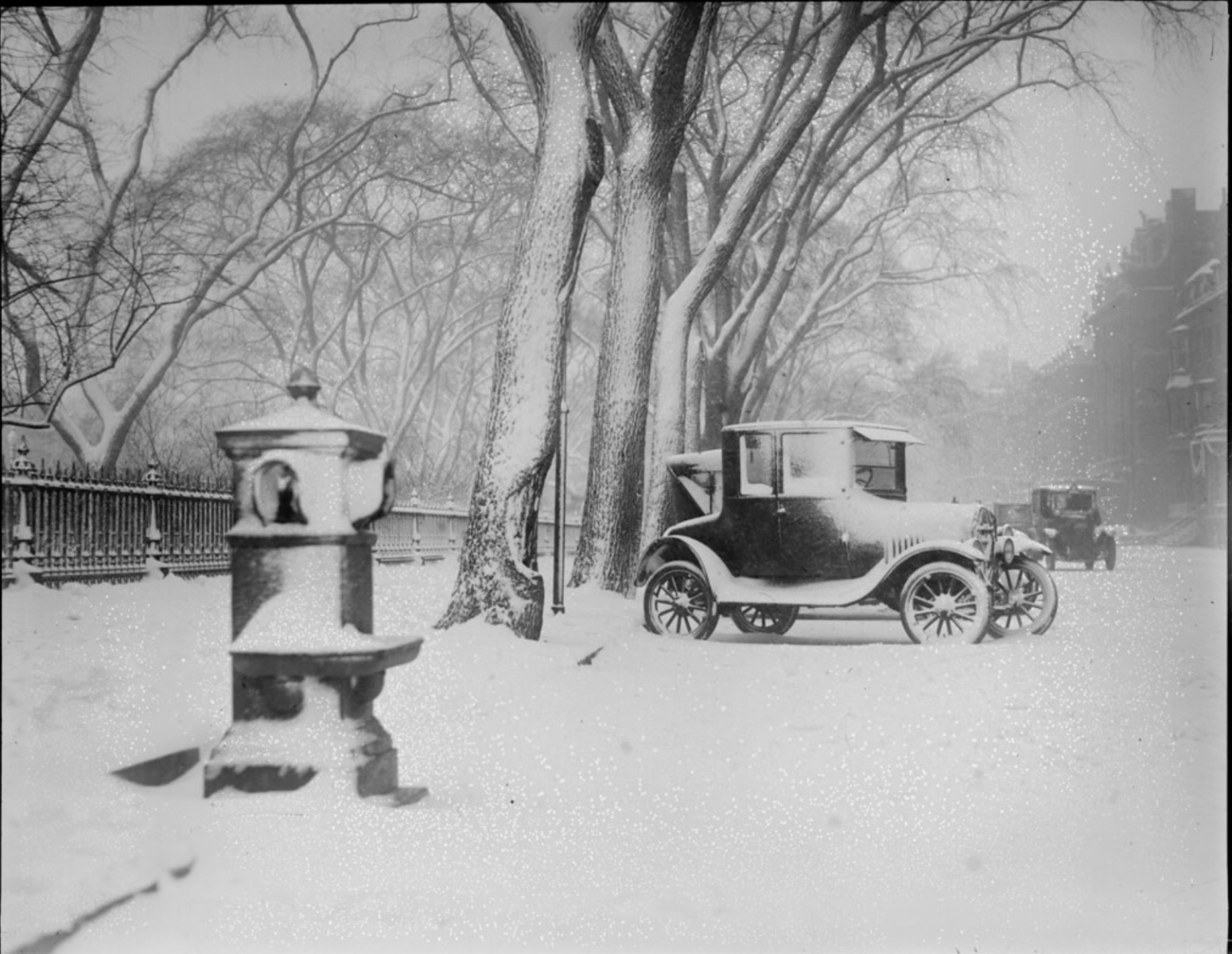 The first photo looks like Lafayette Park in St. Louis. What is the object in the left foreground? Public horse water'er?