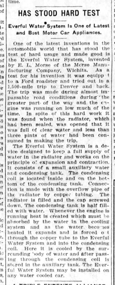 When reading the article on the Everful Water System, it basically describes an overflow tank that also condenses the steam, and most likely siphons the captured overflow back into the radiator similar to modern systems but without pressure. No mention of any mechanism to perform the task.John E. Guitar wrote: ↑Sun Jul 26, 2020 2:39 amI guess the thing on the front of the car in the second photo is part of the Everful Water System.