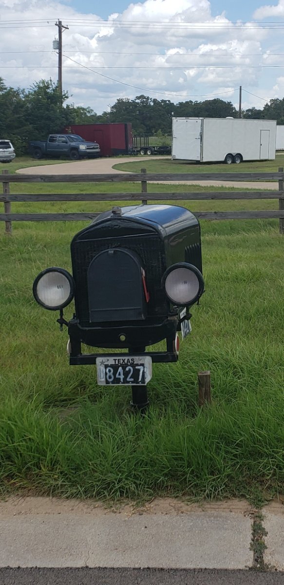 I had the pleasure of going to Ross Lilleker's shop in College Station, Texas yesterday. Ross has quite an operation there and is quite busy. He had no less than 10 or 12 Model Ts and a whole slew of engines and probably half a dozen workers. I took a double take on his mailbox as I was leaving and snapped this photo.